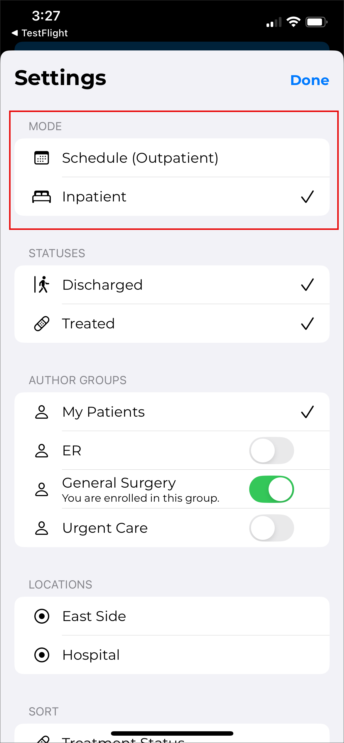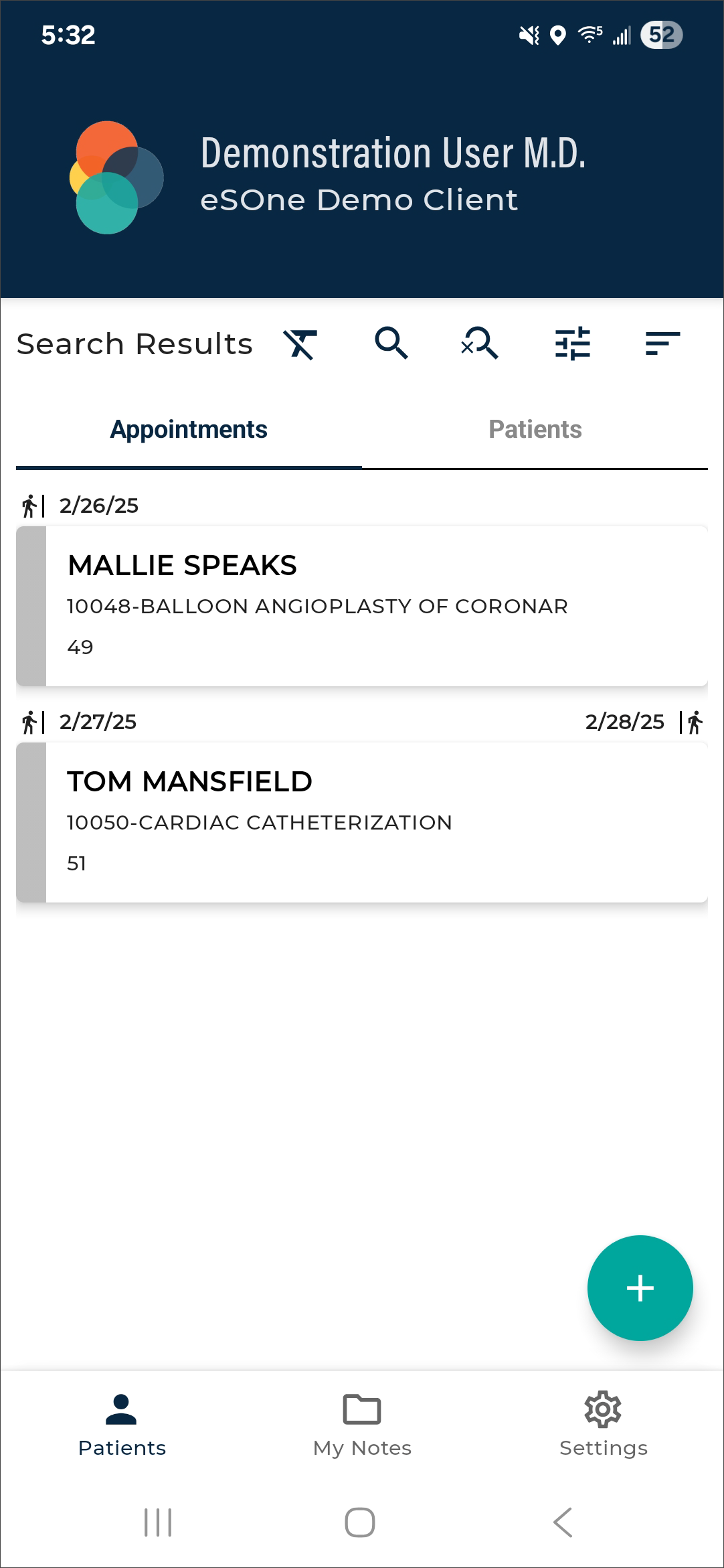 The eSOne mobile app supports outpatient and inpatient schedules. By default, the app opens to schedule (outpatient) mode. The mode can be changed in Filters the schedule filters. This section of the user guide will focus on the outpatient schedule mode. See Inpatient Workflow for more information about inpatient mode.