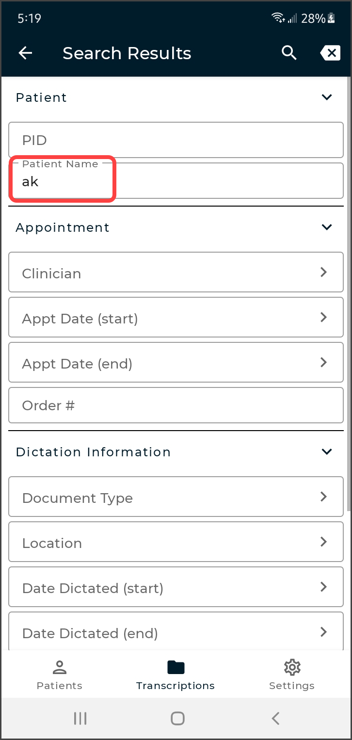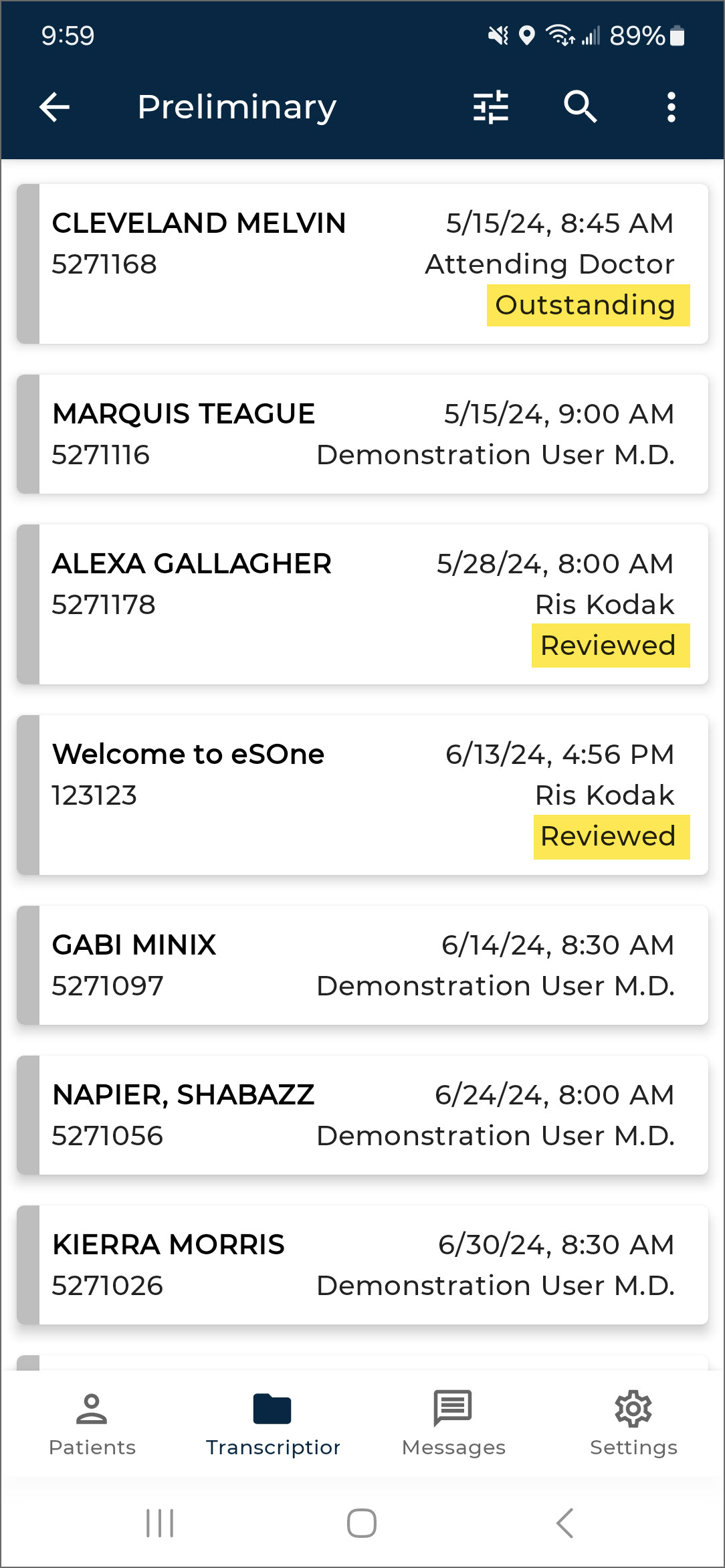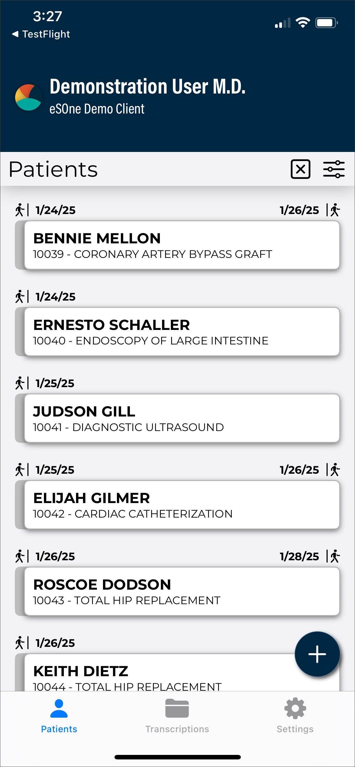 The eSOne Mobile application screens have three tabs at the bottom: Patients, Transcriptions, and Settings. Use these to navigate between the main screens of the app. The active tab is indicated with bold text and black-filled icons. The eSOne Mobile application displays the Patients tab after your initial login, or the last screen you visited in your previous session.