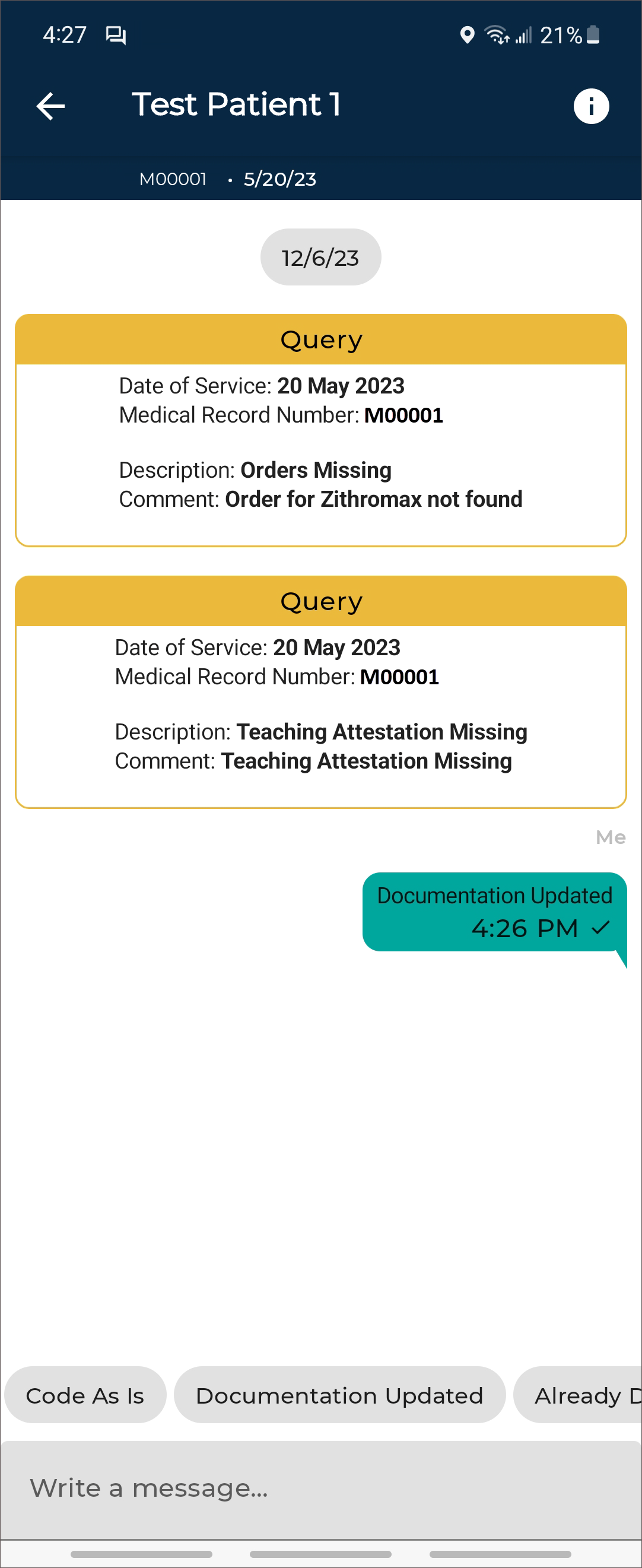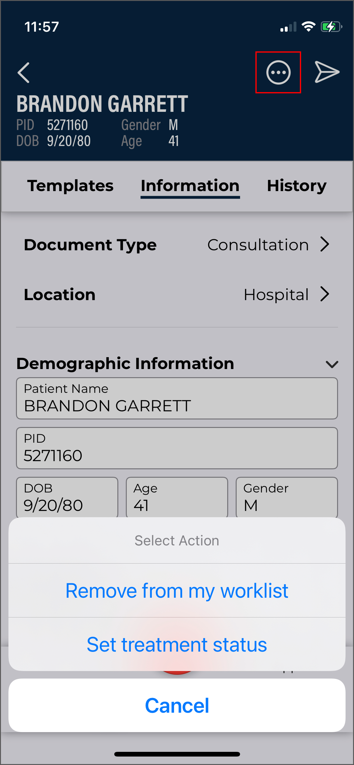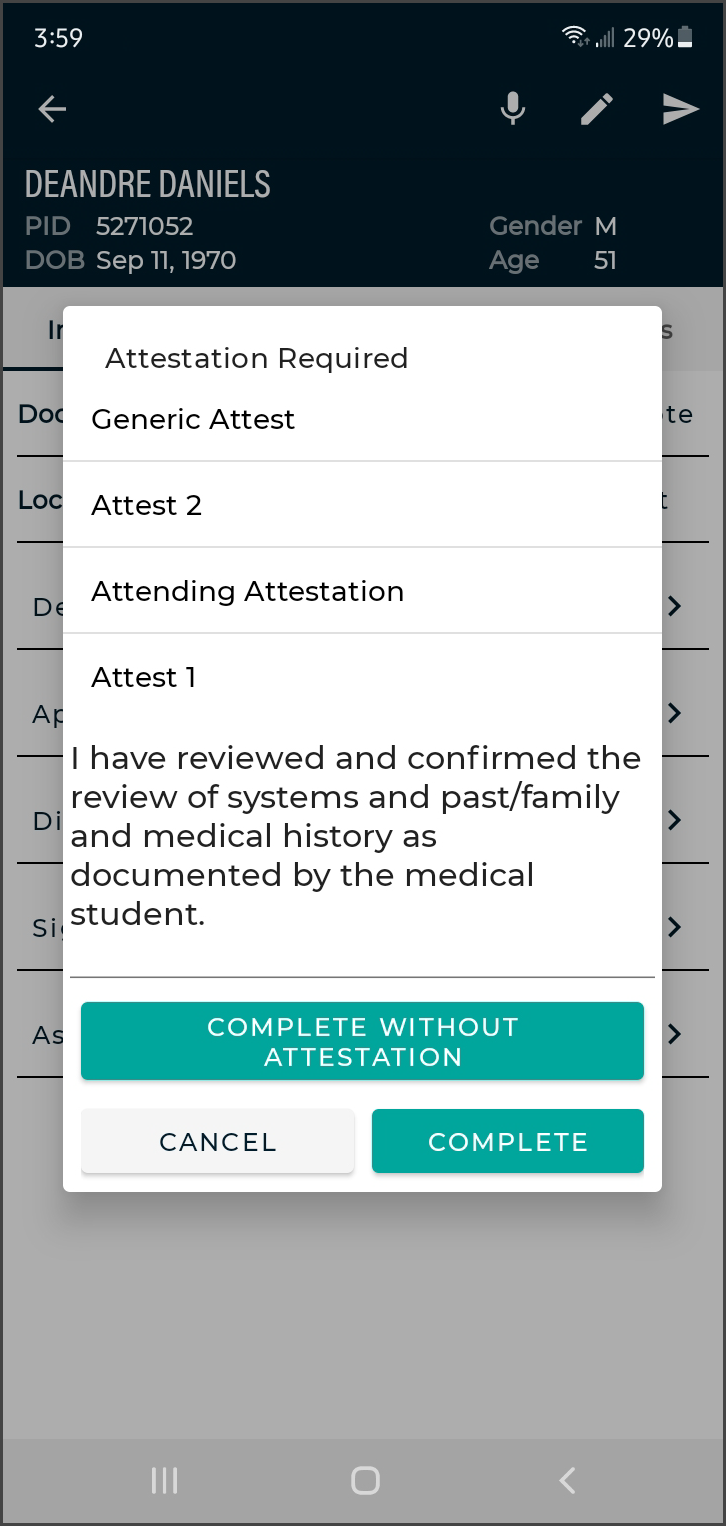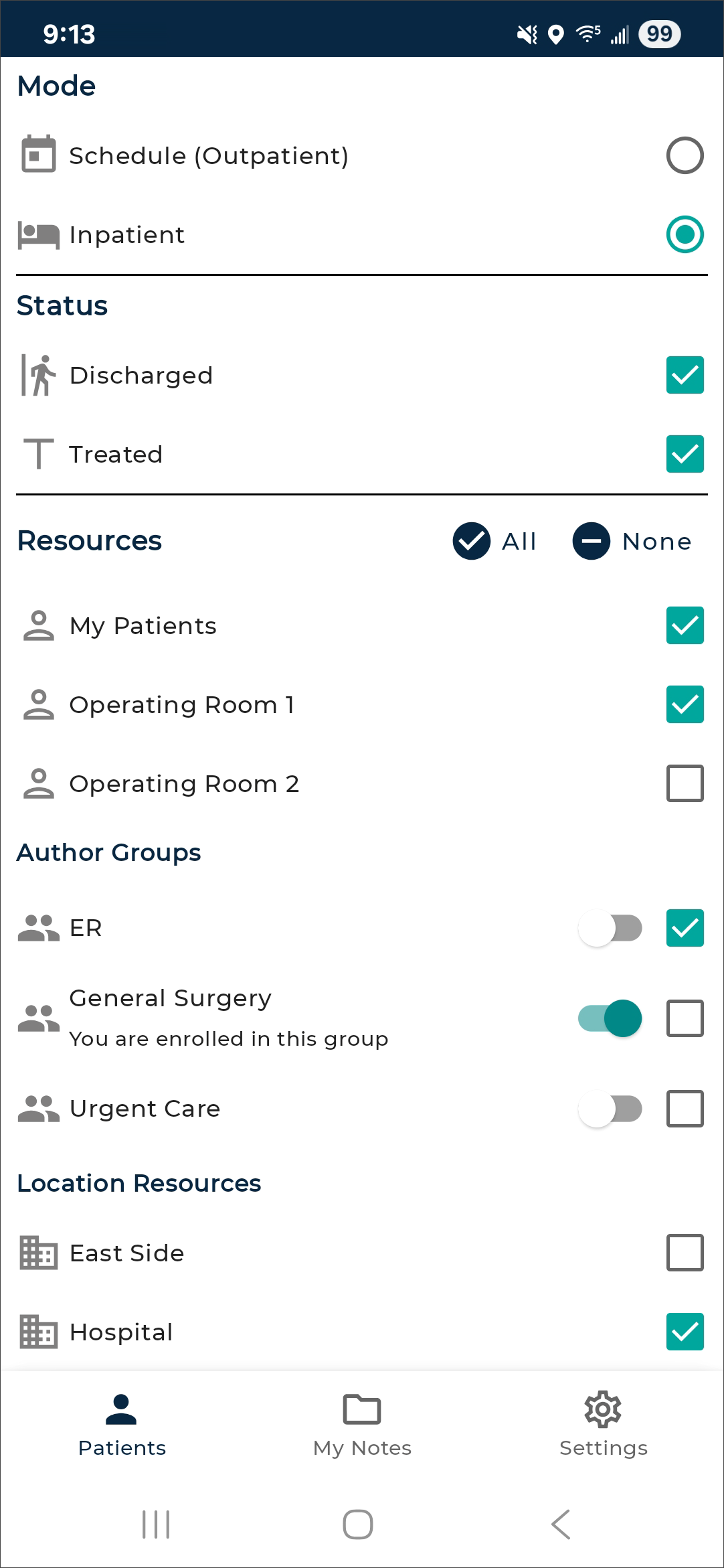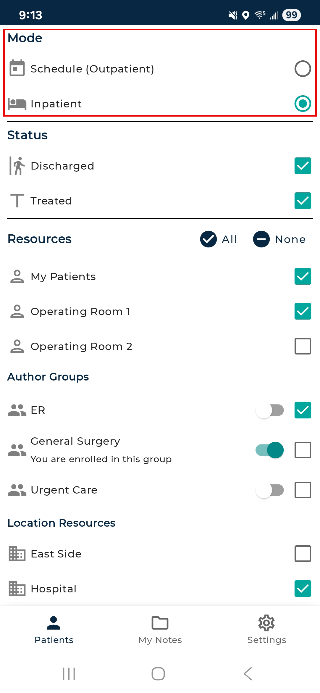 If the client supports both inpatient and outpatient workflows, users can switch between them by tapping the desired mode. For more information regarding the inpatient workflow within the mobile app, please see Inpatient Workflow. The following information in this section assumes an outpatient workflow is being used.