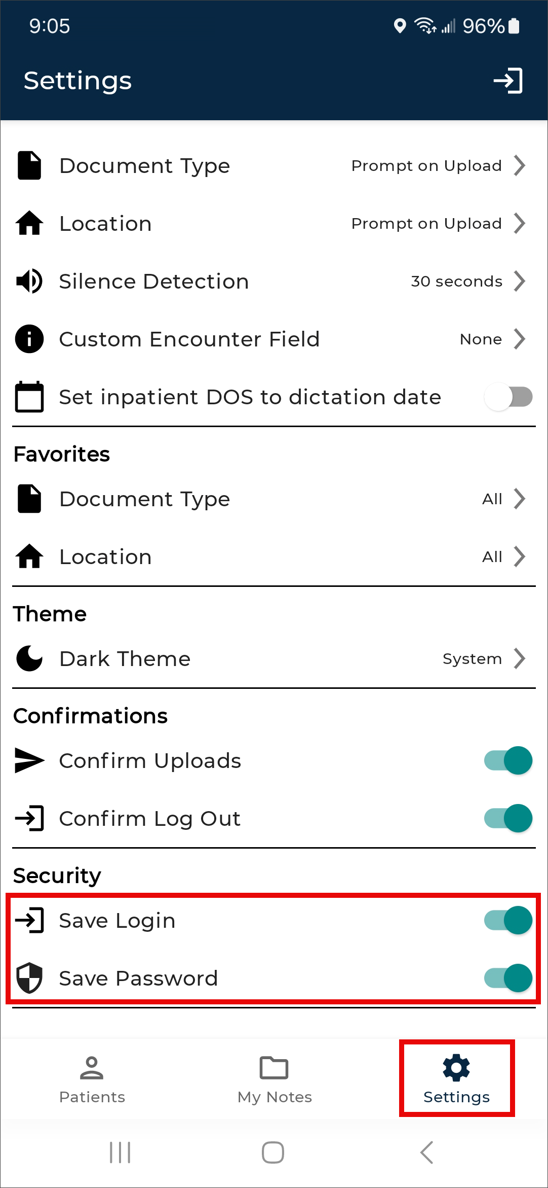If saving passwords is not allowed for users, the 'Save Password' option will be disabled on the Settings screen.