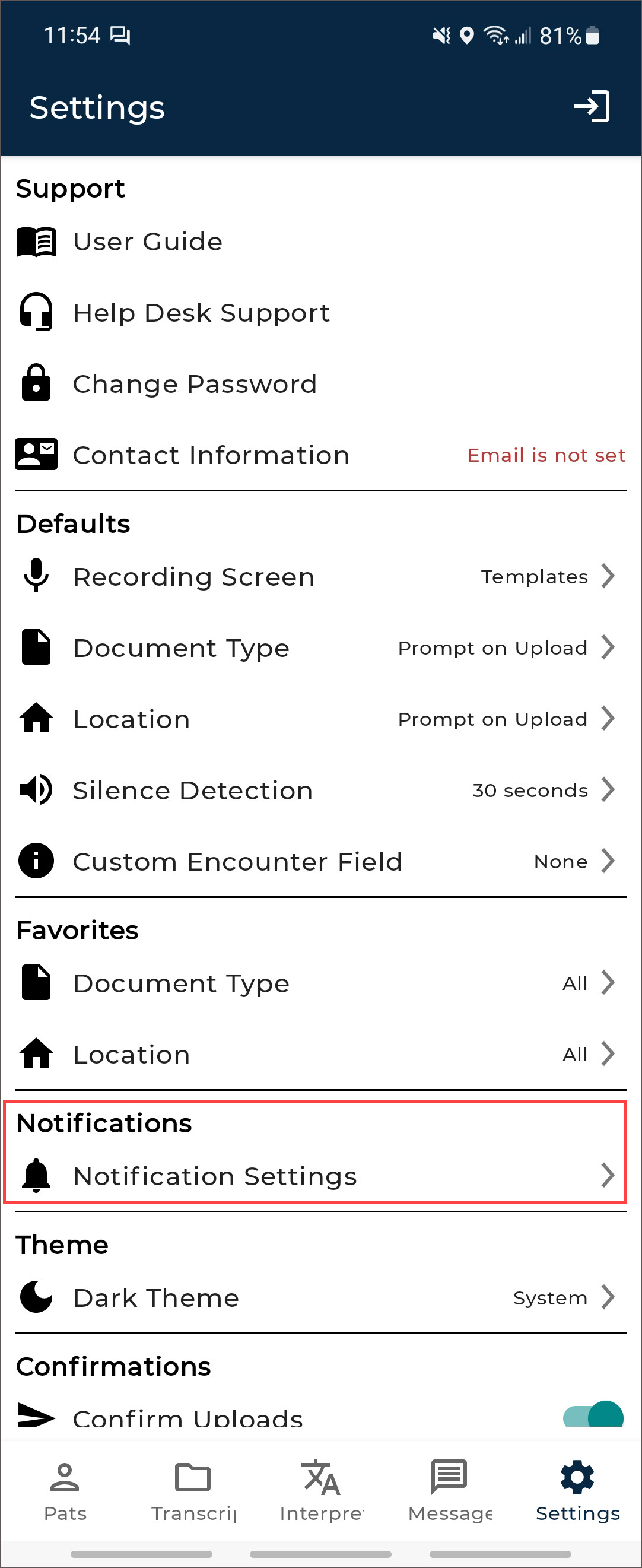 The Settings tab opens the Settings screen, where users can configure default settings for appointments, document types, locations, and other application features. Users can also add or switch to linked accounts from this tab, as well as log out of the mobile app.