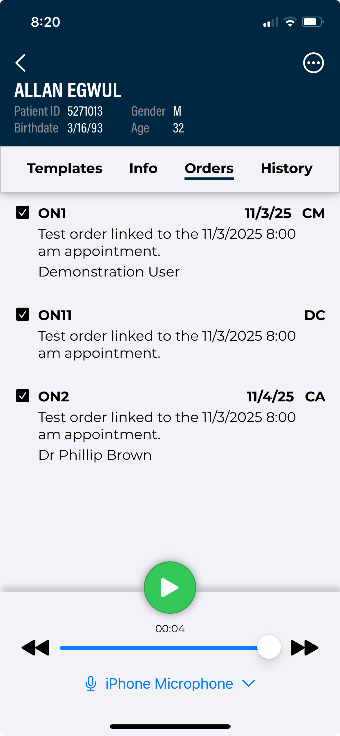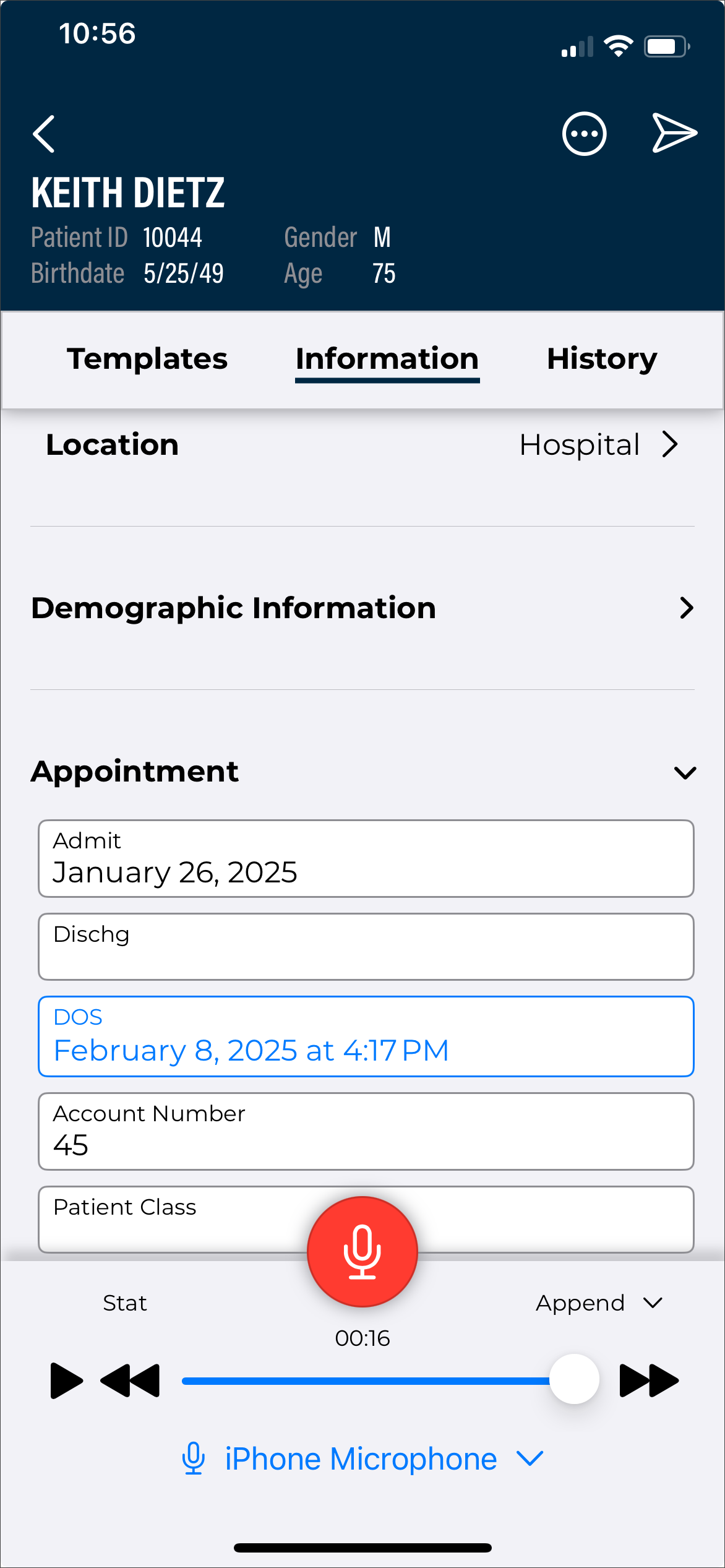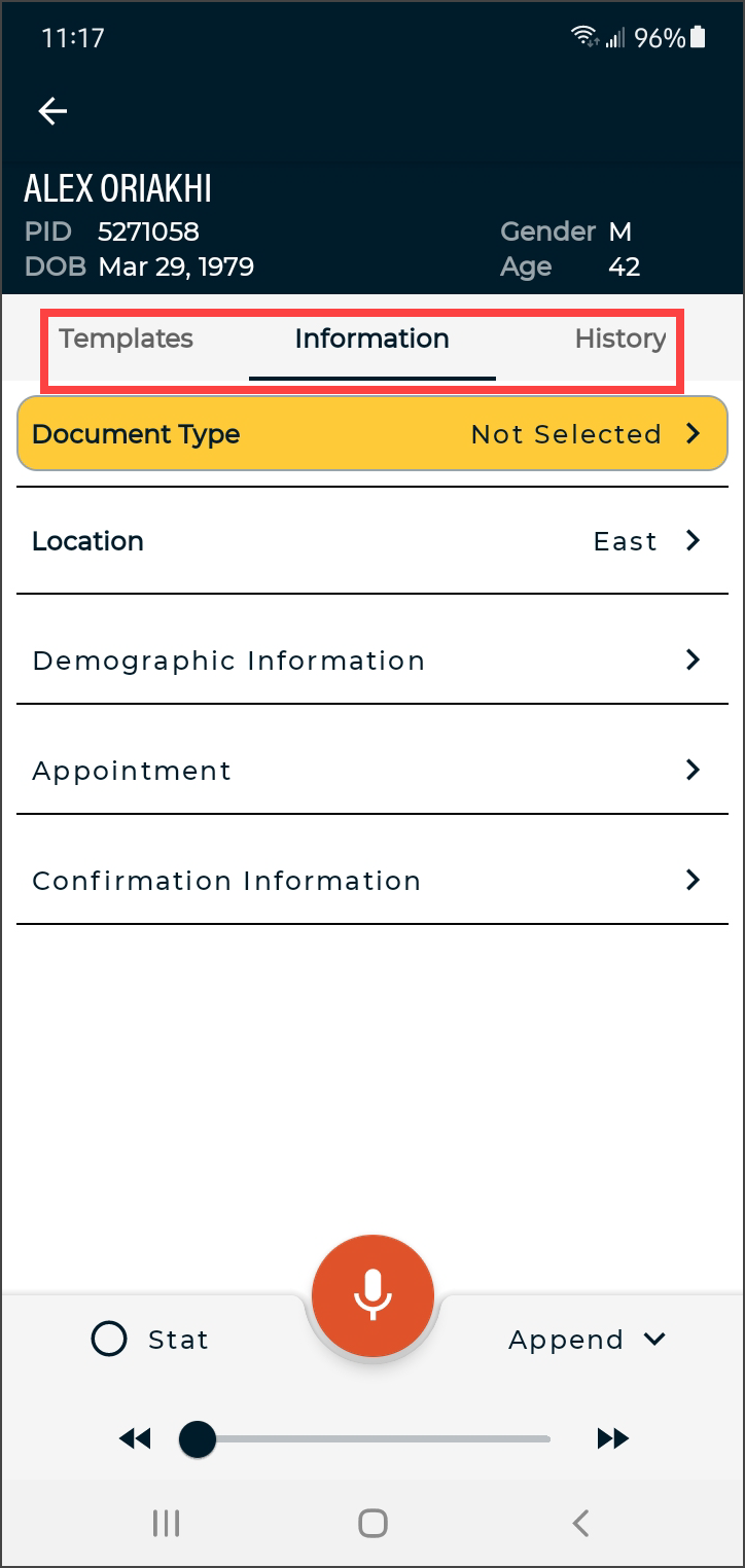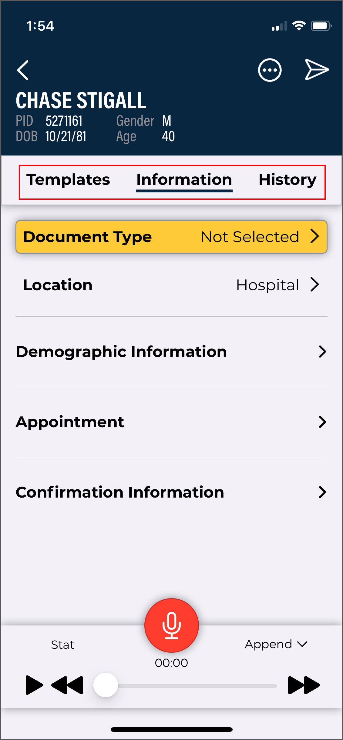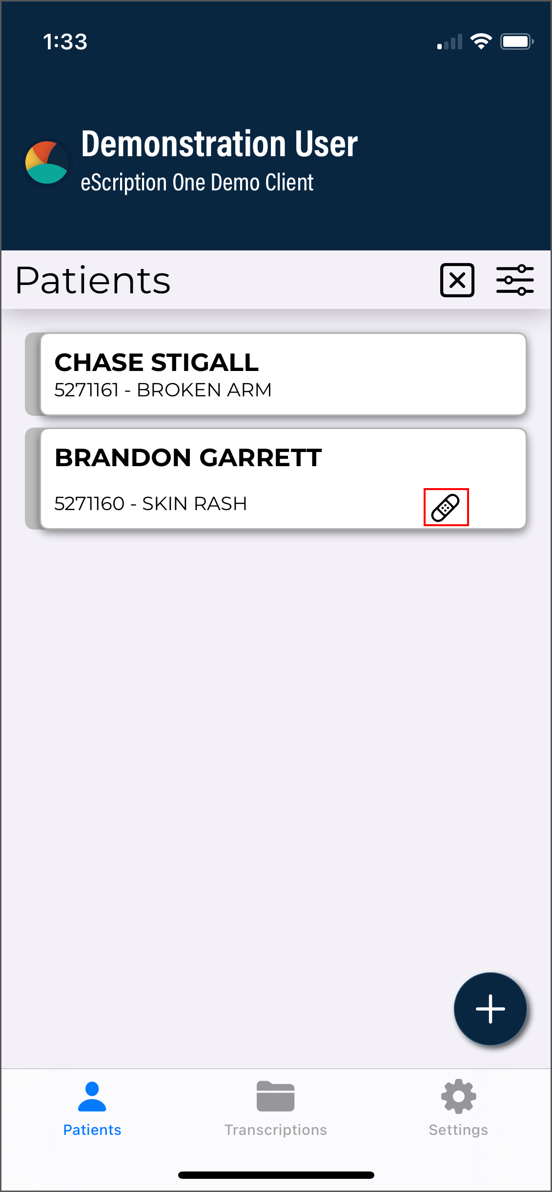 Use the Patients tab to view a list of patient appointments/encounters and create dictations.