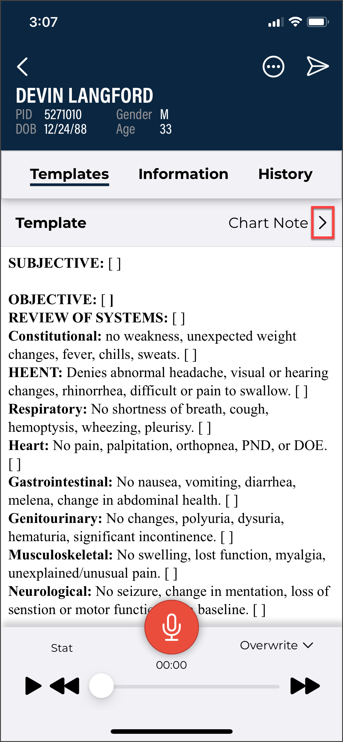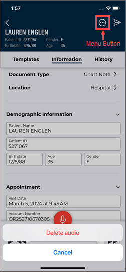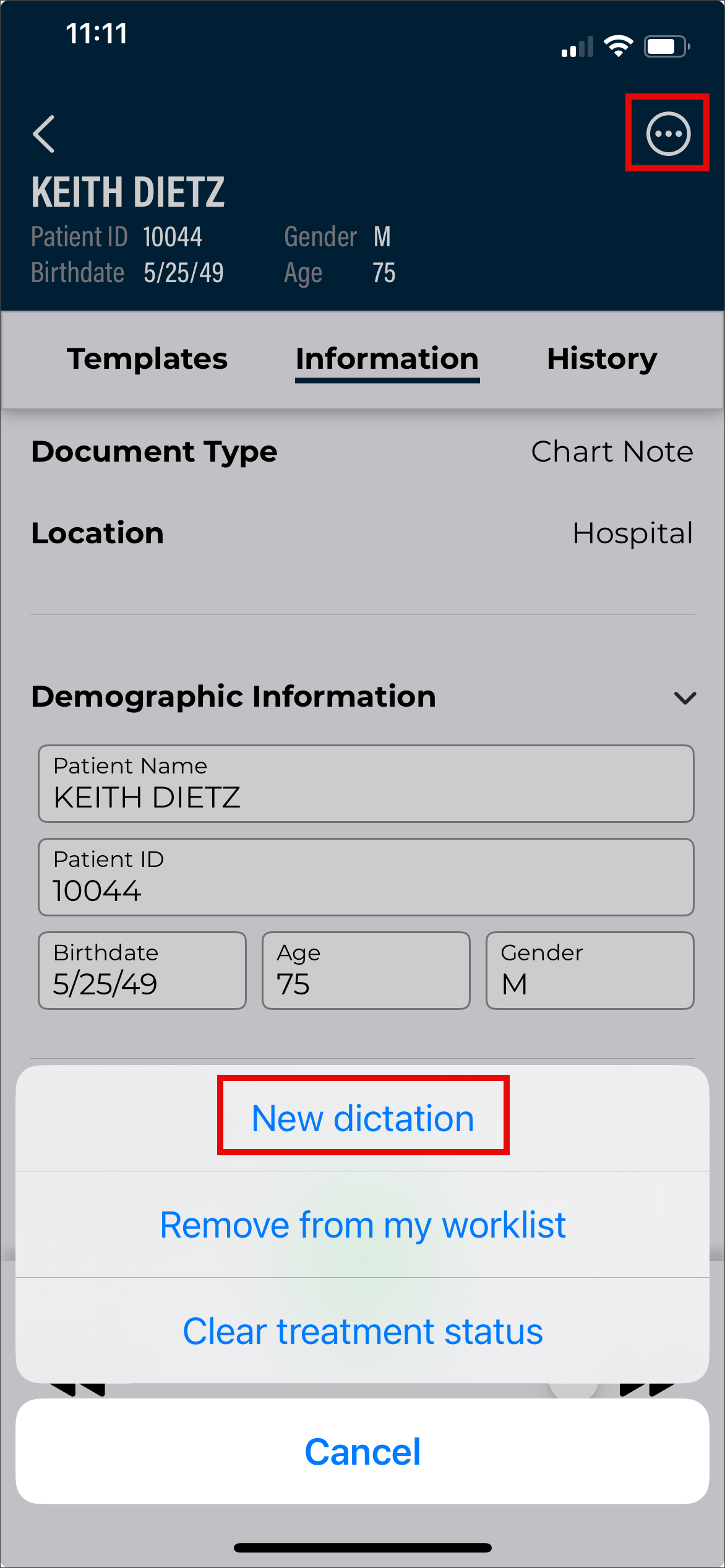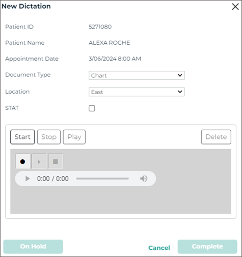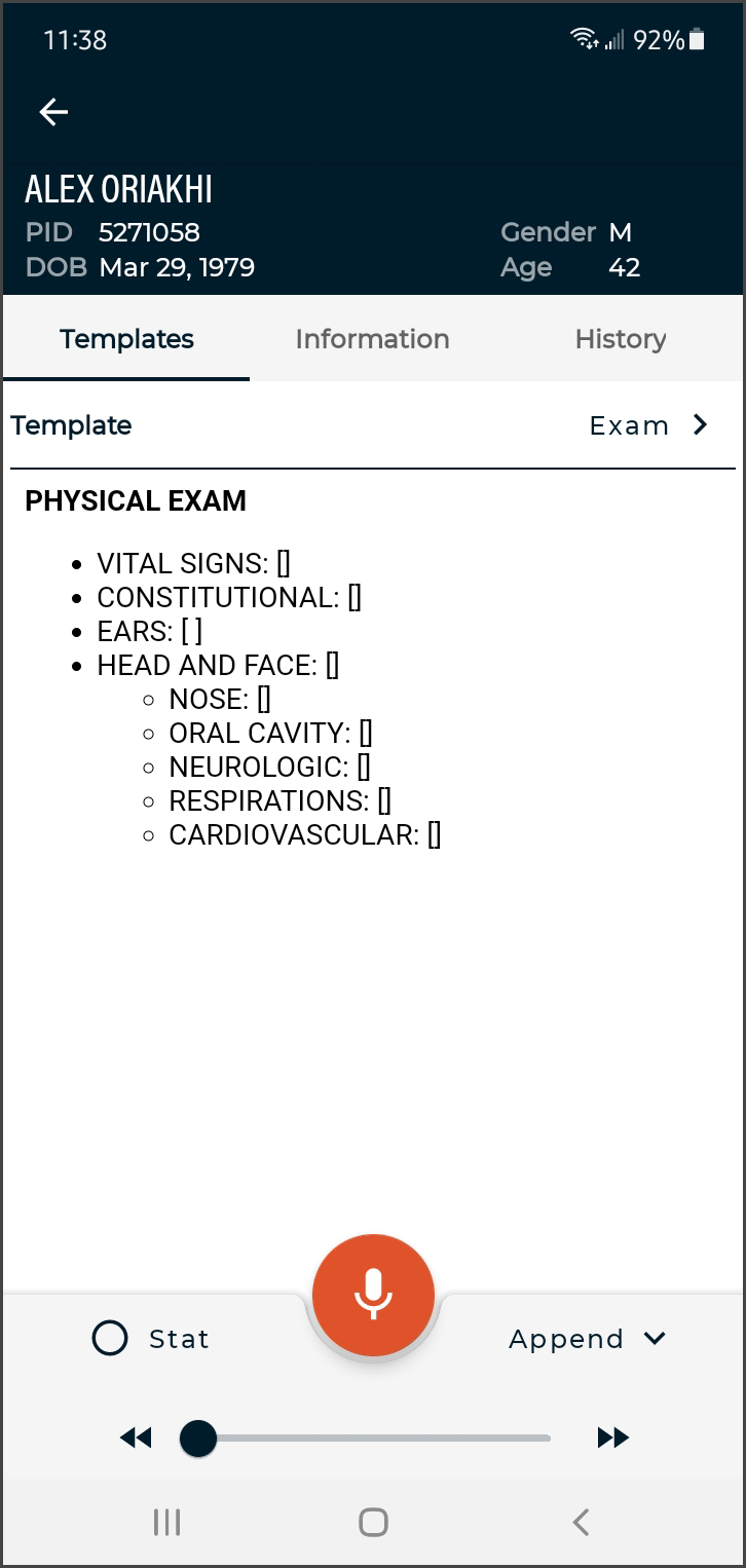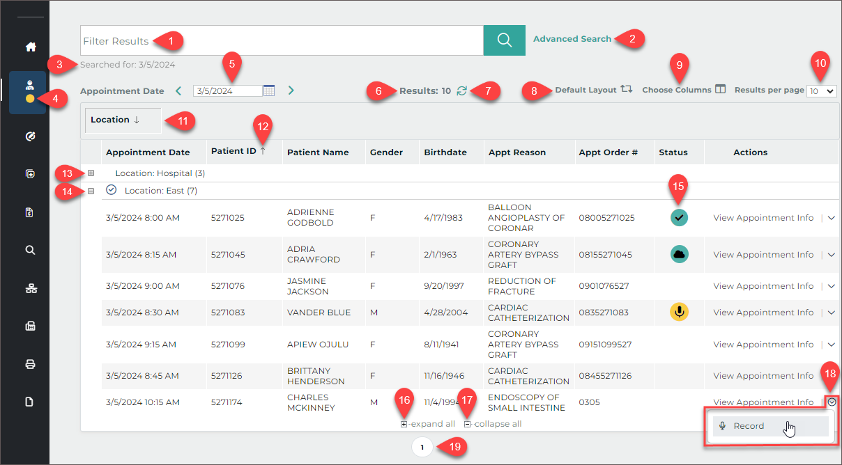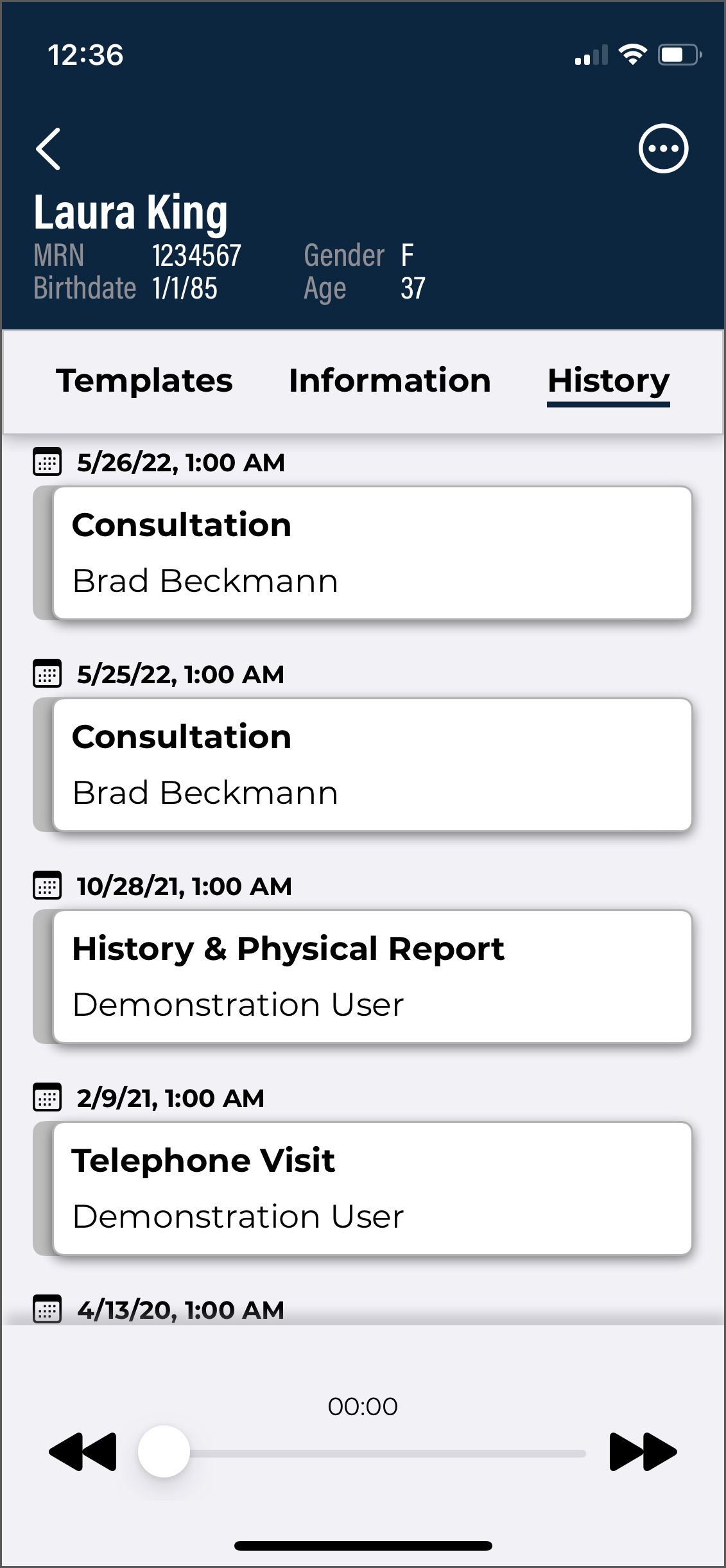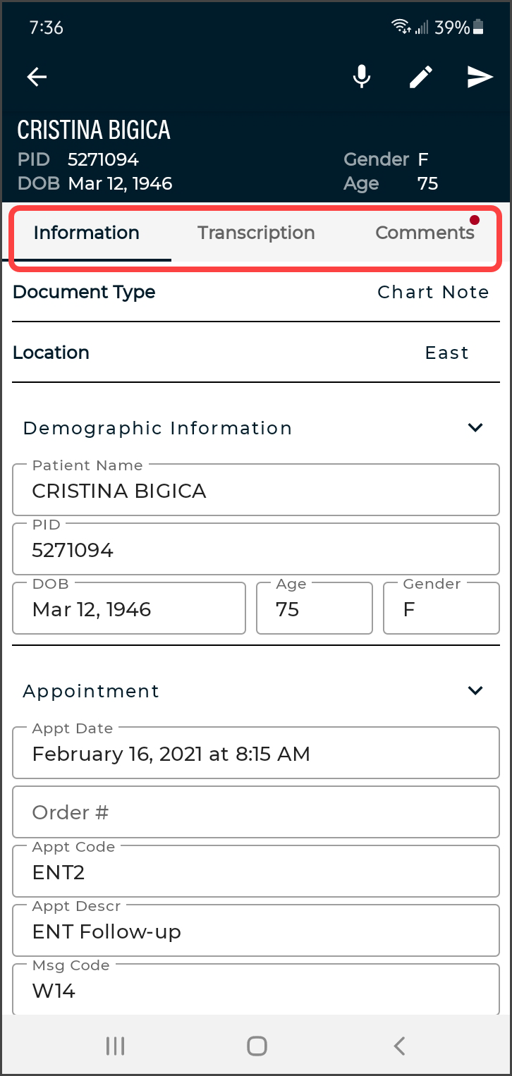 Use the Patients tab to view a list of patient appointments/encounters and create dictations.