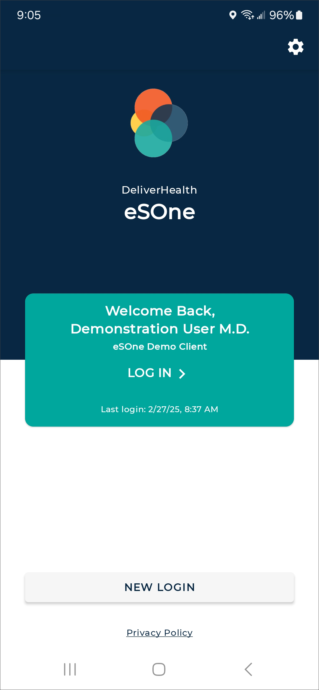 To start eSOne Mobile, tap the application icon. Use your InQuiry login credentials to log in. Both dictating users and non-dictating staff can log into eSOne Mobile.