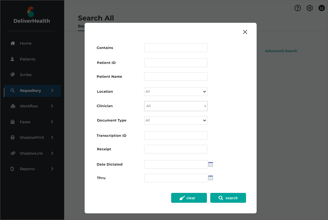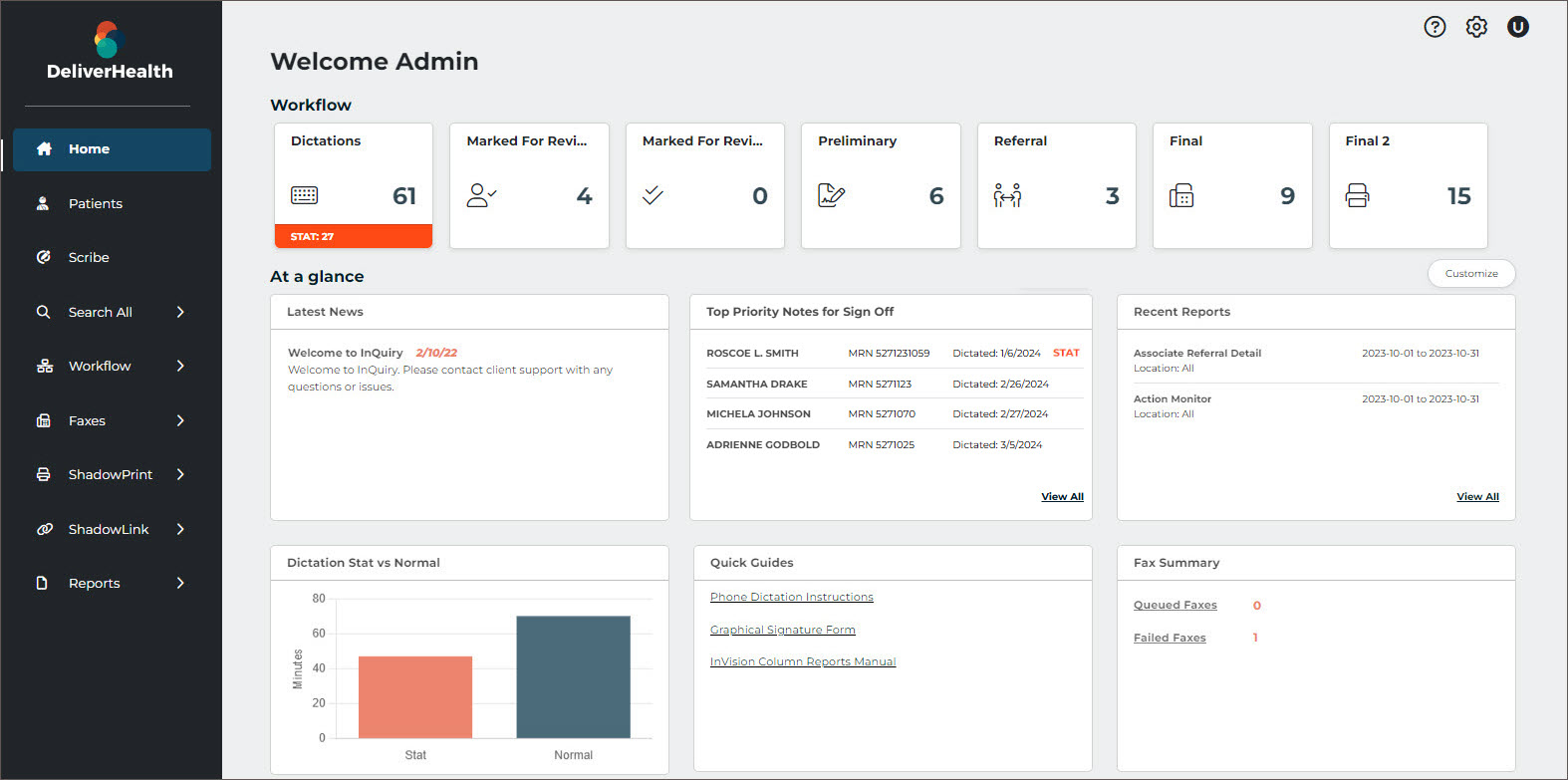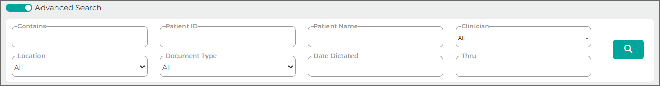 The patients tab opens the Patients screen, where users can record new dictations and view patient appointments (in an outpatient workflow) and/or inpatient encounters (in an inpatient workflow).