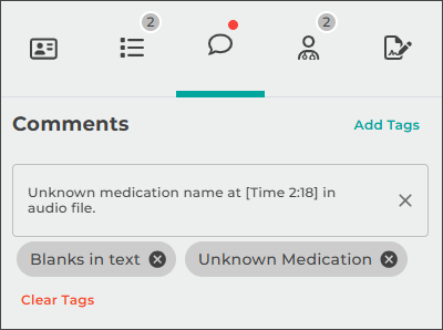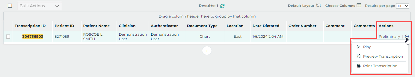 The Transcriptions tab opens the Transcriptions screen, where users can view, approve/sign, and edit transcriptions.