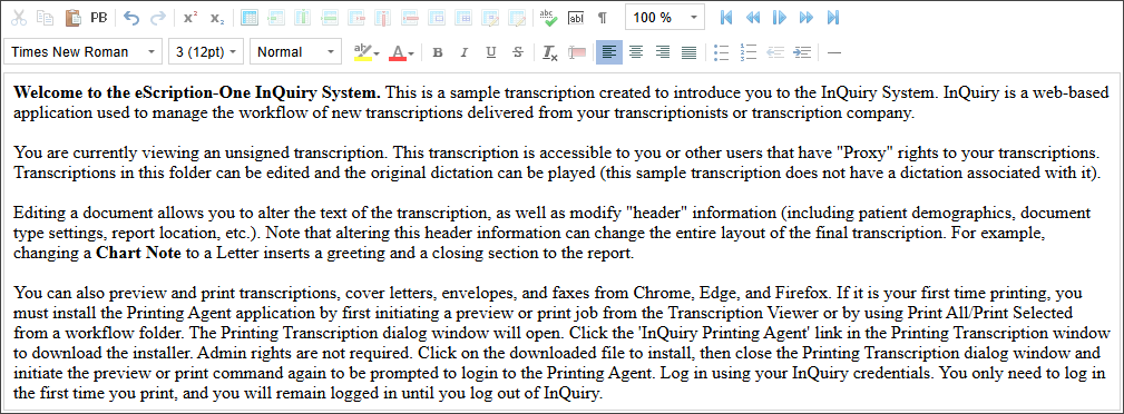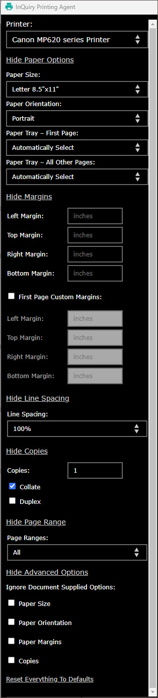 InQuiry supports custom printing in multiple browsers using a printing agent application. Users can preview and print notes, cover letters, envelopes, and faxes from Chrome, Edge, and Firefox.