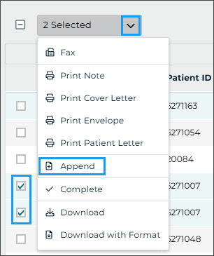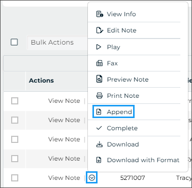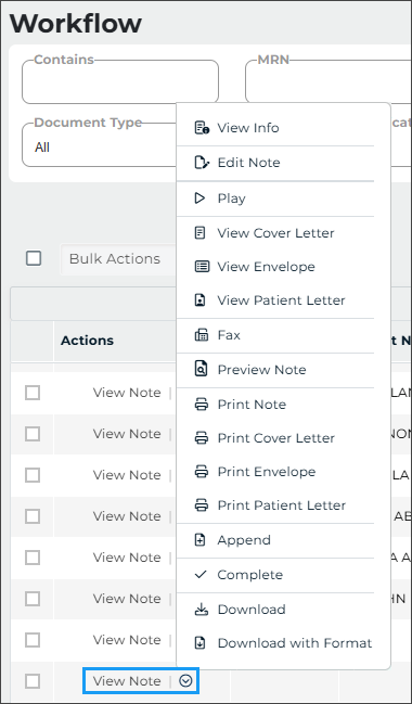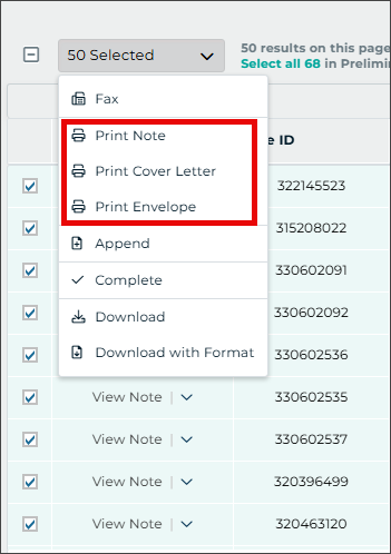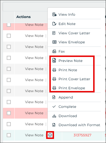 From any workflow folder or Search All, select Preview Note, Print Note, Print Cover Letter, or Print Envelope from the Actions column.