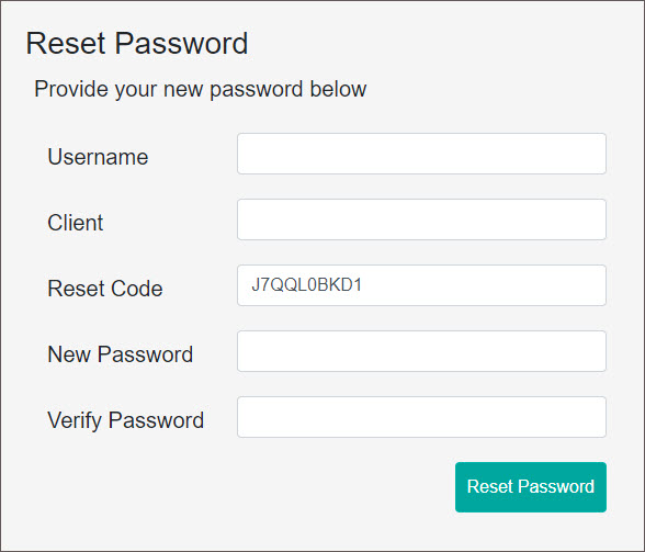 If you choose Have reset code?, the ‘Reset Password’ screen appears without the reset code filled in. Enter the code and remaining information, then click the Reset Password button.