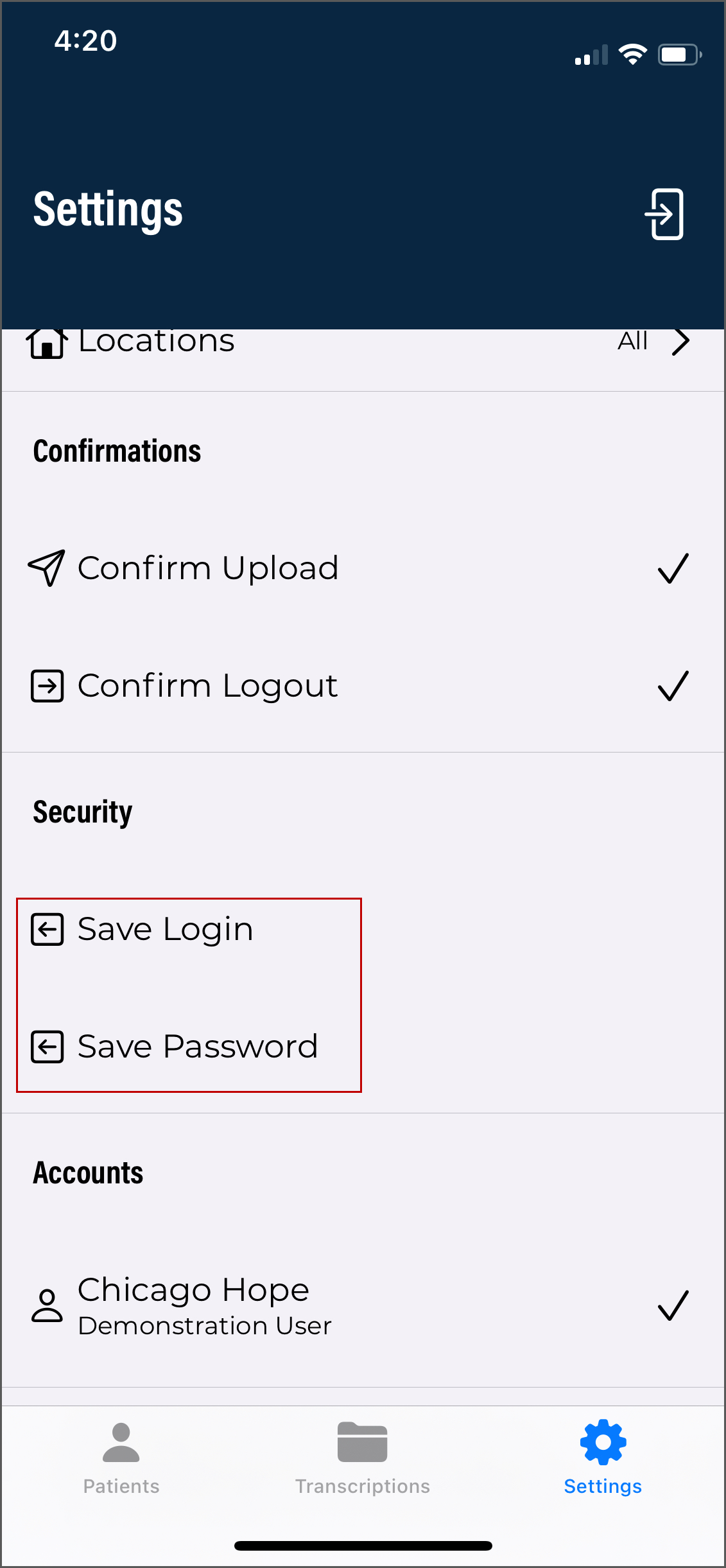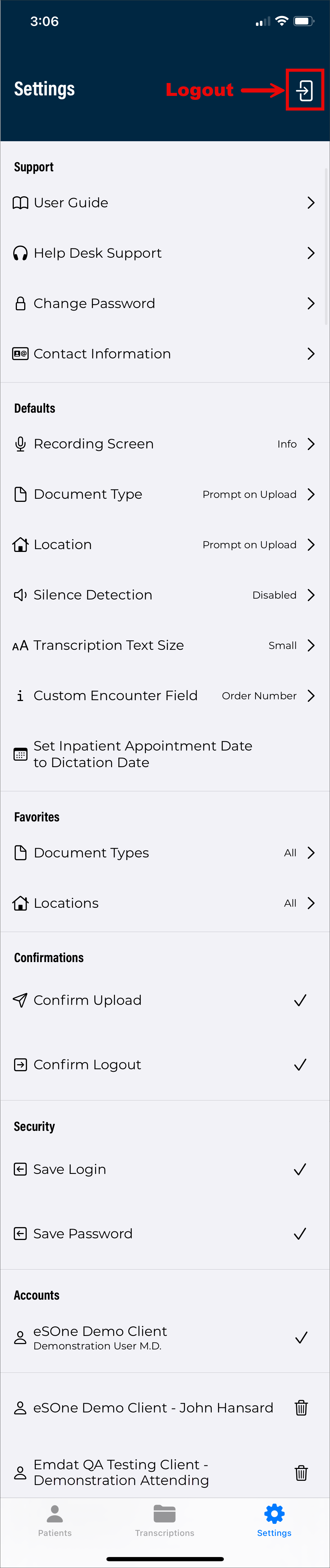 For security reasons, we recommend logging out of the mobile app when it is not in use. To do so, navigate to the Settings tab then tap the Logout icon in the upper right corner.