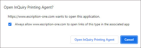 Your browser may ask if you want to allow InQuiry to open the eSOne Printing Agent. To prevent the dialog from appearing every time, allow your browser to always open links of this type. Click Open InQuiry Printing Agent or Allow.