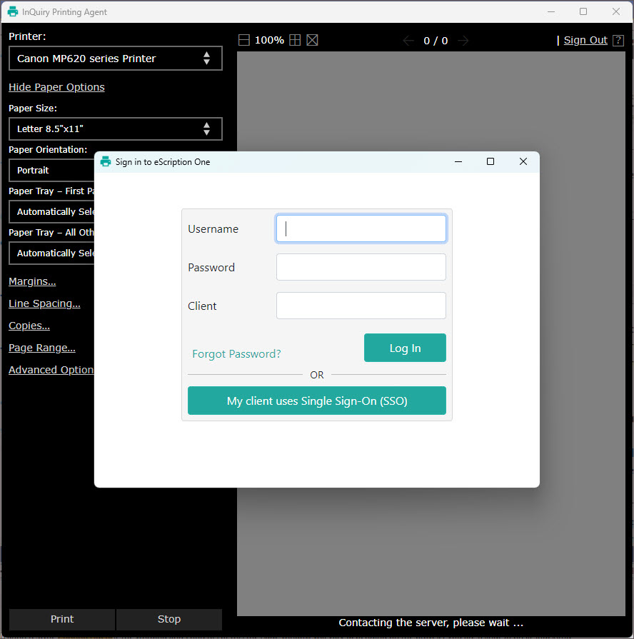 To preview and print from the Printing Agent, log in using your InQuiry credentials. You only need to log in the first time you print. You will stay logged in until you log out of InQuiry.