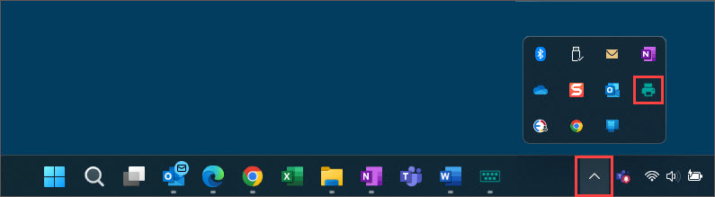 The agent continues running in the Taskbar Corner Overflow. To reopen it, click the up arrow in the taskbar and then click the Printing Agent icon. It also reopens automatically on the next preview.